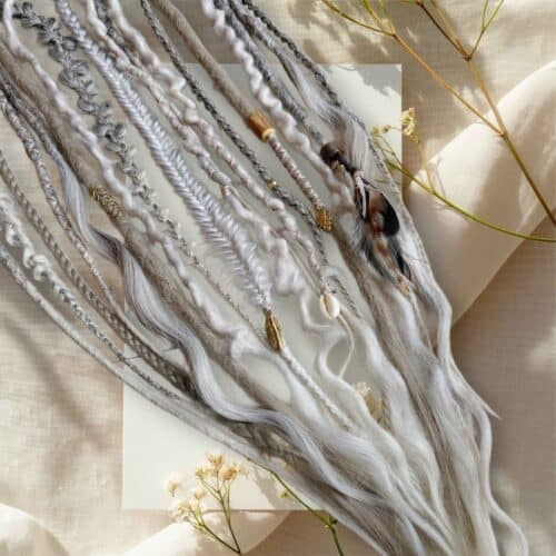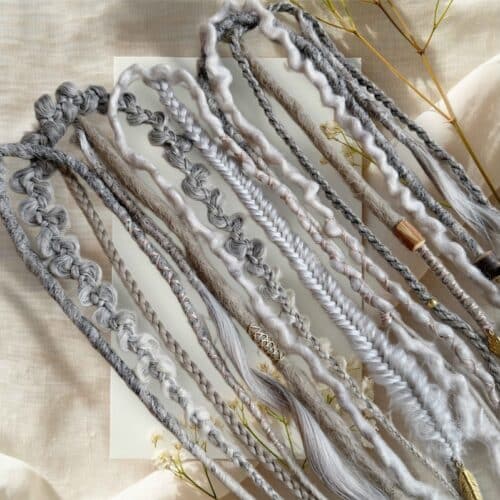 12 single and double ended synthetic and wool dreadlock extensions 50/55cm in grey and light ashy warm white blonde blends.