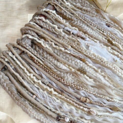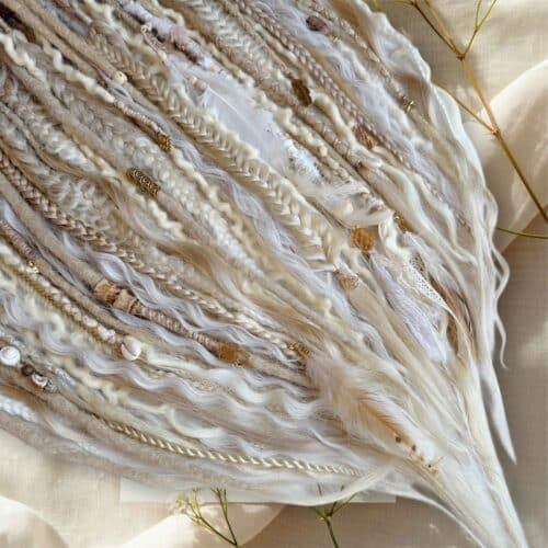 50 Synthetic and Wool Dreadlock Extensions 50/55cm in light buttercream, platinum and sandy blonde blends.
