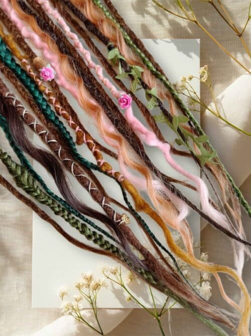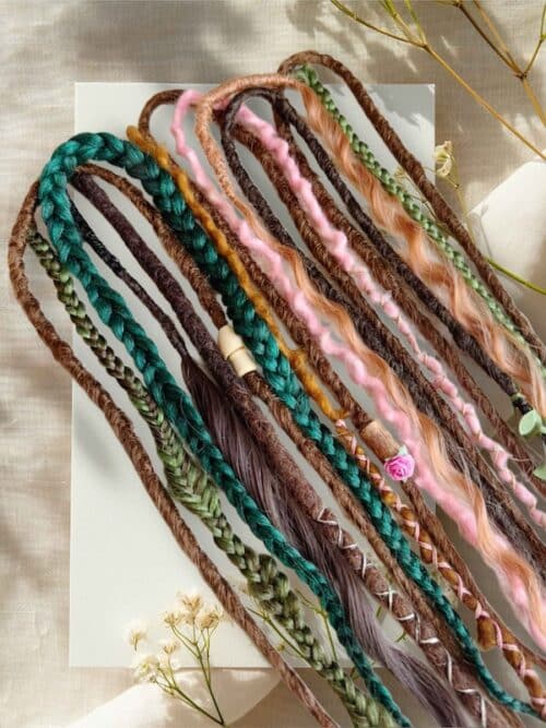 12 single and double ended synthetic and wool dreadlock extensions 50/55 cm in green, pink, brown and copper blends.