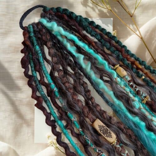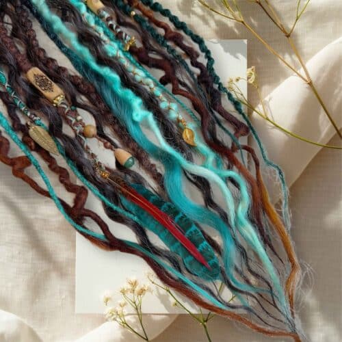 10 single ended and double ended ended synthetic and wool dreadlock extensions 50/55cm in blue, turquoise dark brown, golden brown and black blends.