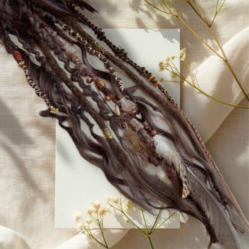 8 dreadlock extensions (single and double ended synthetic and wool dread extensions in dark and lighter brown blends)