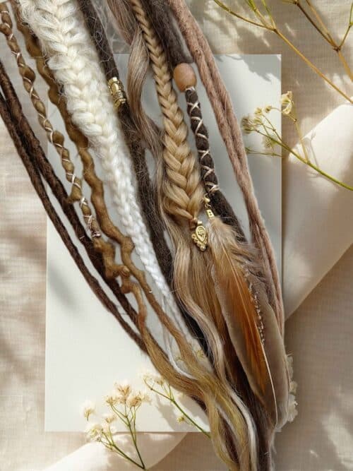 8 dreadlock extensions (single and double ended synthetic and wool dread extensions in warm brown, dirty (warm) blonde blends)