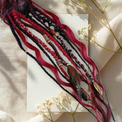 8 dreadlock extensions (single and double ended synthetic and wool dread extensions in red and brown blends)